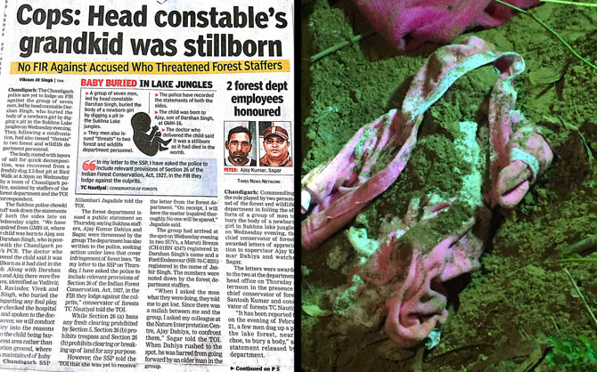 चंडीगढ़ में फॉरेस्ट एरिया में एक नवजात बच्ची को दफनाने के मामले ने तूल पकड़ लिया है। बच्ची के शरीर पर नमक का लेप लगा होना और उसे वहां दफनाने वाले पुलिसवालों के रवैये ने मामले की गंभीरता को बढ़ा दिया है। स्थानीय पत्रकार विक्रम जीत सिंह के मुताबिक, बुधवार की शाम वह सुखना झील के किनारे जंगल वाले इलाके में घूम रहे थे। उन्हें बर्ड्स वॉच का शौक है और इसी सिलसिले में वह वहां मौजूद थे कि उनकी नजर कुछ लोगों पर पड़ी। वे जमीन खोद रहे थे। उन्हें कुछ ठीक नहीं लगा तो उन्होंने तुरंत फॉरेस्ट गार्ड्स को इसकी सूचना दी और मामला पता करने को कहा। जब गार्ड्स जमीन खोद रहे लोगों के पास जानकारी लेने पहुंचे तो उन्हें मामले से दूर रहने को कहा गया। यह भी आरोप है कि उन्होंने खुद को पुलिस विभाग का बता गार्ड्स को धमकियां भी दीं। यह 21 तारीख की शाम पांच-साढ़े पांच बजे के आस-पास का वक्त था। इसे संदिग्ध जानकर श्री सिंह ने शहर की एसएसपी को फोन कर दिया, जिन्होंने एक पुलिस टीम को घटनास्थल भेज दिया। श्री सिंह उस टीम और फॉरेस्ट गार्ड्स के साथ रात करीब साढ़े आठ बजे उस गड्ढे को ढूंढने में कामयाब रहे, जहां बच्ची को दफनाया गया था। यह बर्ड वॉच के पास एक ताजा खोदा गया करीब 2.5 फीट का गड्ढा था। बच्ची को वहां से निकालकर उसका पोस्टमार्टम करवाया गया है। सुखना पुलिस चौकी स्टाफ ने दोनों पक्षों के बयान दर्ज कर लिए हैं। तफ्तीश के दौरान बच्चे का जन्म कराने वाले डॉक्टर ने जांच टीम को बताया कि बच्ची की मौत कोख में ही हो गई थी, यानी उनके मुताबिक यह स्टिलबर्थ का केस है। घटना के अगले दिन फॉरेस्ट डिपार्टमेंट के श्री टीसी नौटियाल ने एसएसपी को पत्र लिखकर दोषिय़ों के खिलाफ इंडियन फॉरेस्ट कन्जर्वेशन एक्ट 1927 के सेक्शन 26 की धाराओं को भी शामिल करने का अनुरोध किया, जो इस तरह के मामले में एप्लीकेबल हों। हालांकि एसएसपी ने इस तरह के किसी भी पत्र के मिलने से इनकार किया है। श्री सिंह के मुताबिक, बच्ची को दफनाने के लिए उस दिन सात लोग दो एसयूवी में आए थे। गार्ड्स ने मारुटी ब्रेजा (CH-01BN 4347)और फॉर्ड एन्डेवर (HR-70-C 8231) का नंबर नोट कर लिया था। वह शक जताते हुए कहते हैं कि बच्ची शायद हेड कांस्टेबल दर्शन सिंह की पोती नहीं, बेटी थी, जो किसी अमान्य रिश्ते से जन्मी थी। इसीलिए उसे मार कर दफना दिया गया। उन्होंने बताया कि उन्होंने अपने स्तर से हेड कांस्टेबल के बारे में पता किया है और उनके बार में उन्हें अच्छी रिपोर्ट नहीं मिली है। वह इस मसले को लेकर एसएसपी नीलाम्बरी जगदाले से भी व्यक्तिगत रूप से मिले और मामले की जांच करवाने की बात कही। इस दौरान एरिया डीएसपी भी वहां मौजूद थे। जैसे ही उन्होंने बच्ची का डीएनए सैंपल लेने की बात कही, आमतौर पर शांत रहने वाले वह डीएसपी उखड़ गए और काफी उग्र हो